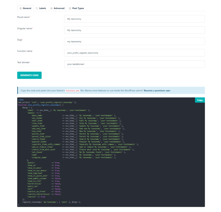 - No coding required: No need to write any code, simply fill in the form and generate the code for your custom taxonomy.